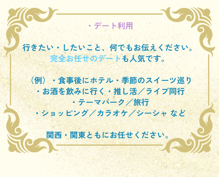 お話も含めデート内容は、お客様それぞれに合わせて変えられるスキルをお持ちの方だと思うので安心して一緒にいられるし、誰とも被らないオンリーワンのデートになると思います。