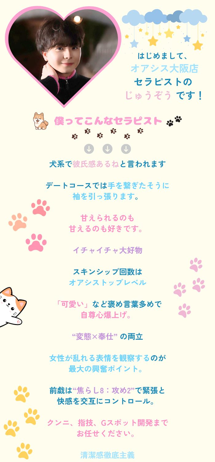 デートの時は優しい落ち着いた雰囲気で、施術の時はちょっとイタズラっ子のような感じでとても癒されます。