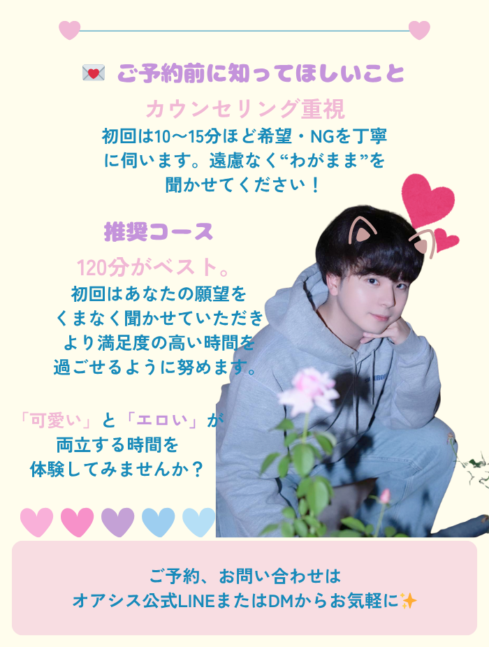 デビューまもないということで当日の流れに若干ぎこちなさはありましたが、それでも一生懸命尽くしてくれてる様子は嬉しく、工程ひとつひとつをじっくりしてくれるのは気持ちよかったです。性感中ちゃんと褒めてくれるのも🫶