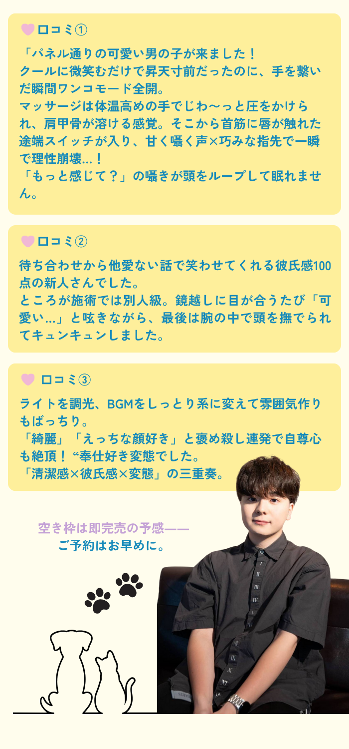 今後人気が出て予約が取りにくくなってしまうのは少し寂しいですが、彼の素晴らしい施術がもっと多くの人に知られてほしいとも思います。最高の時間をありがとうございました。これからも、心から応援しています。近いうちに、必ずまた癒されに伺いますね。