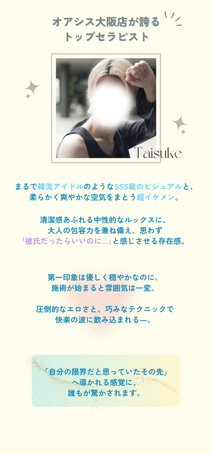 性感のはなしをすると、それは、もぅ今までの女風遊びの中で一番星でした⭐たいすけさんはOASISに彗星のごとくあらわれて、気になってすぐに予約✨