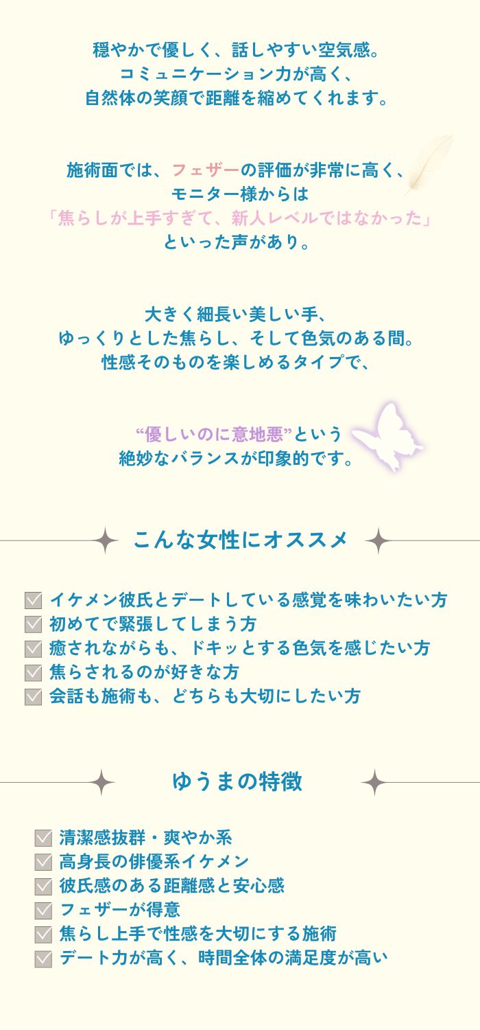 会話は聞き上手で、こちらの緊張をほぐすように優しく話を引き出してくれました。男性経験があまり多くなく、こういったサービスの利用自体が初めてだったのですが、ゆうまさんの落ち着いた対応のおかげで不安がすぐに消え、心地よい時間を過ごせました。
