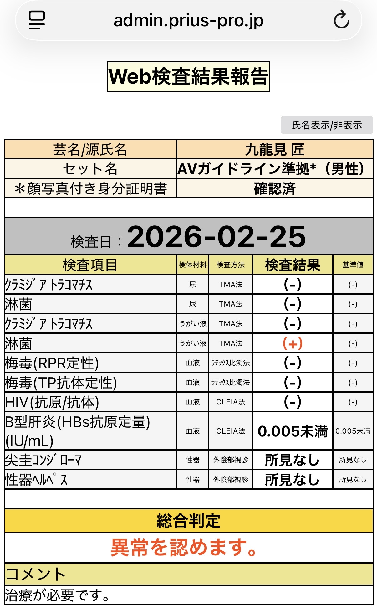 定期的に行っている性病検査の結果、