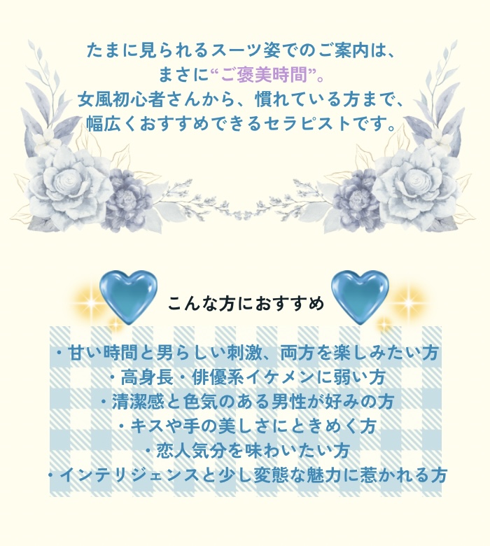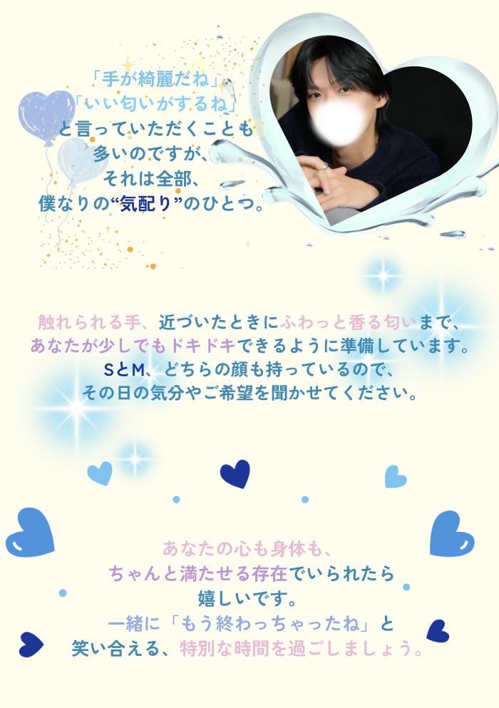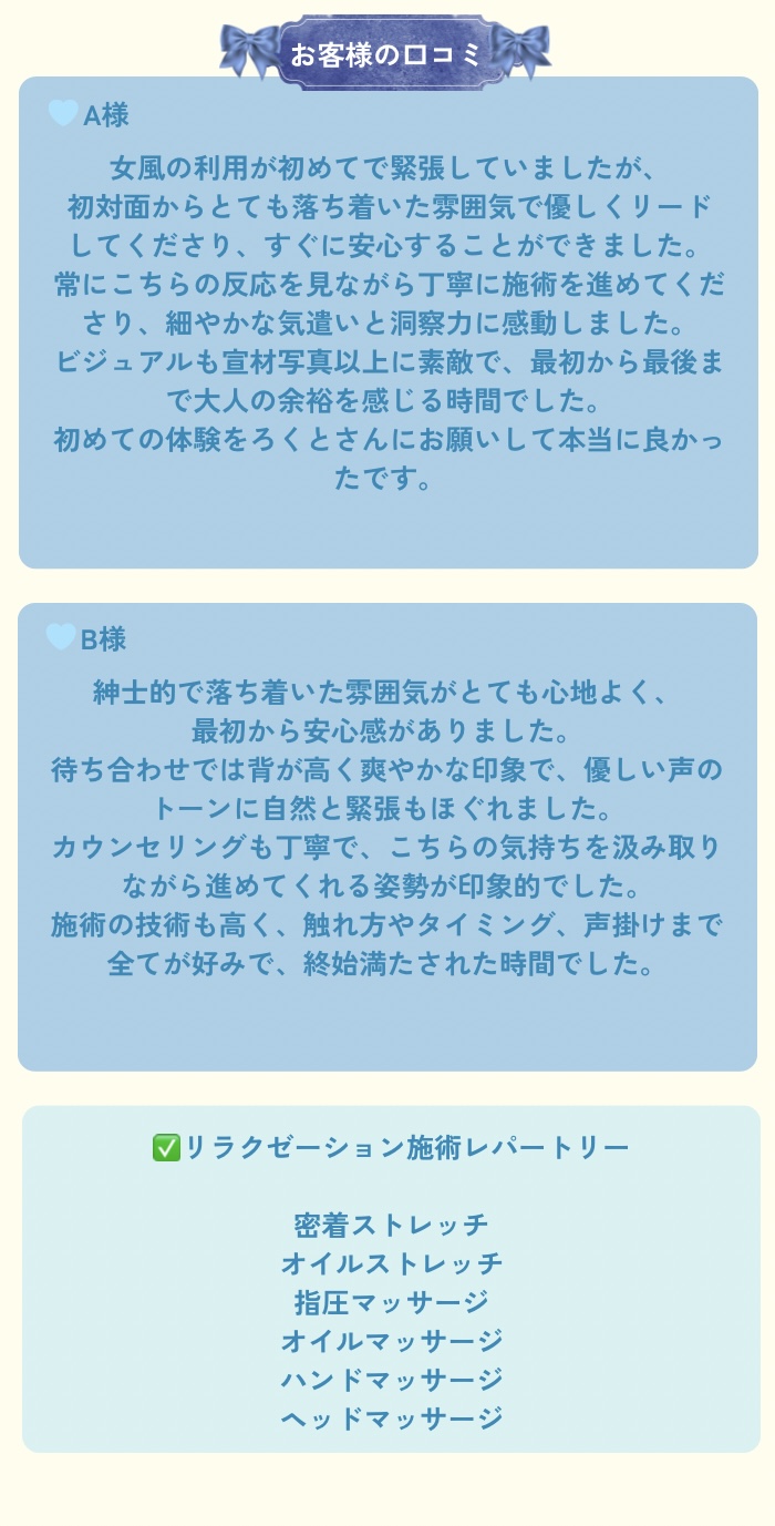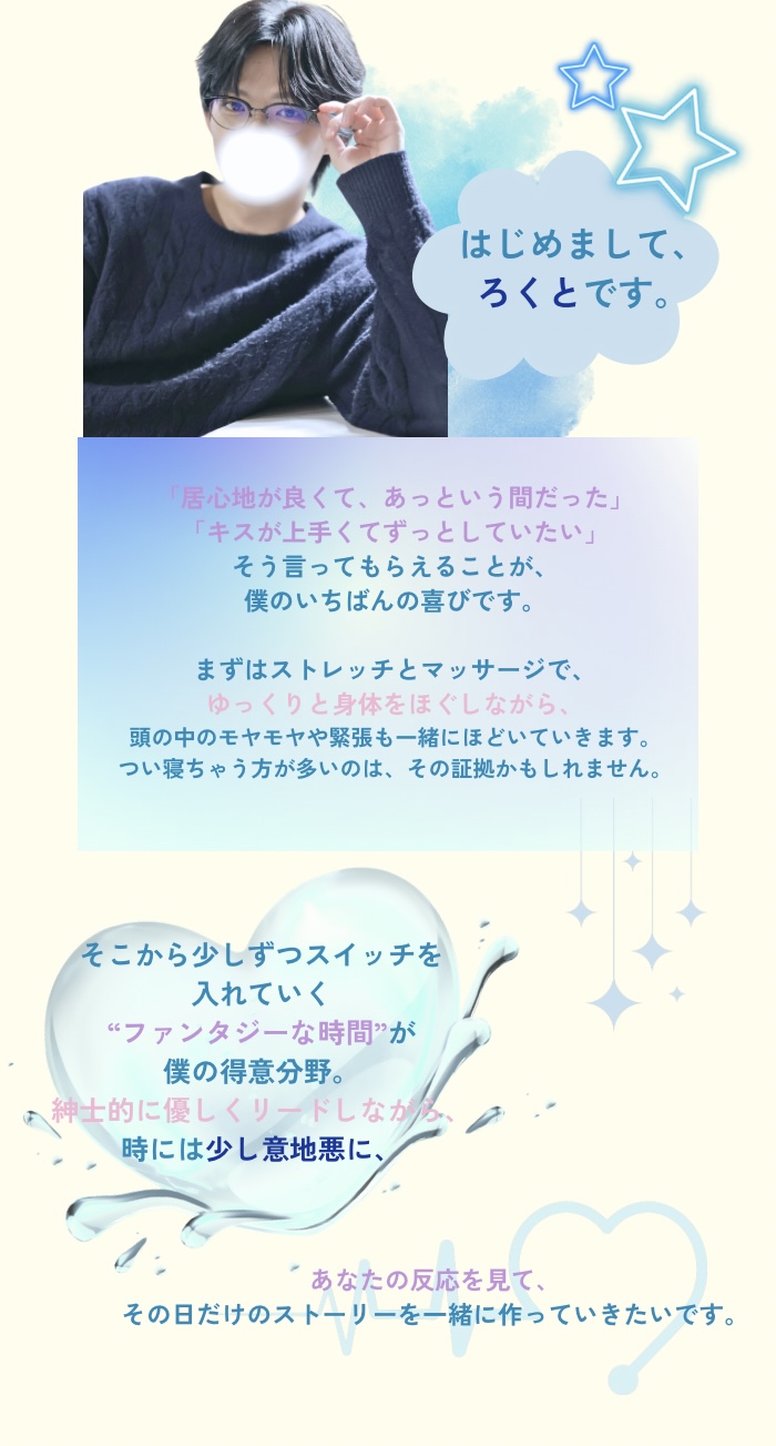 初の女風という体験をろくとさんにお願いして良かったです!ぜひまたお願いしたいと思います🫶