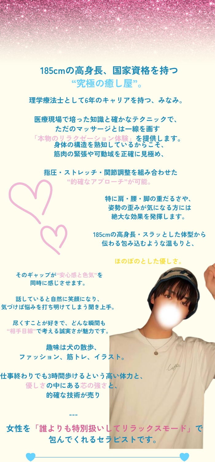 最近の身体や性の悩みもじっくり聞いてくれて、肩や腰が硬くてほぐしてほしいってお願いしたら、みなみくんオリジナルの密着指圧ストレッチや心地よくて色気のあるオイルマッサージで深くほぐしてくれて、帰りは身体が軽くて感動した〜!🥹性感も優しく丁寧にポイントを責めてくれて、忙しい日々の疲れを忘れるような癒しの時間でした✨