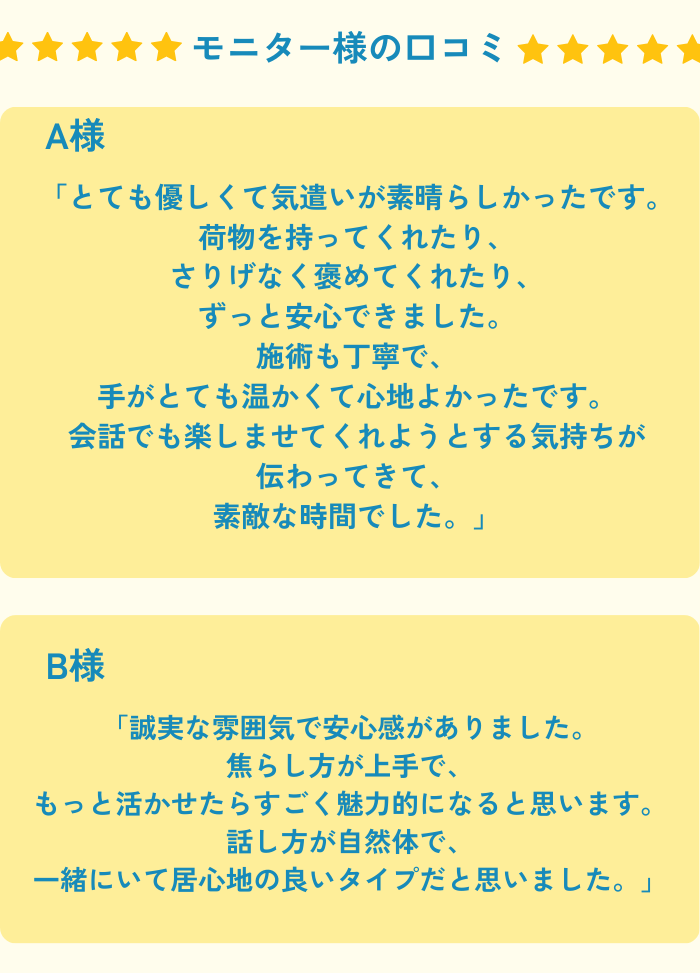 ご予約の際に、(ご利用日・セラピスト名・ハンドルネーム)を添えて「口コミ特典利用」とお伝えください。