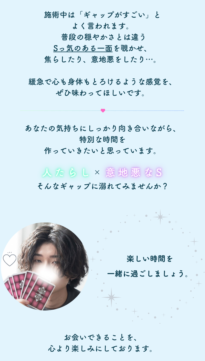 普段は絶対に年下セラピさんは予約しないんですが、キャスの落ち着いた雰囲気と表裏のなさそうな人柄に惹かれてて指名しました!