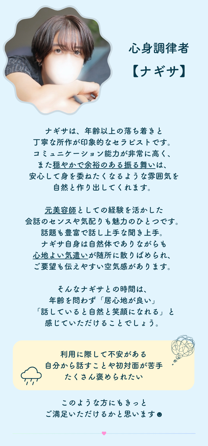 月に一度くらい、自分を整える時間として利用したいタイプのセラピストです。