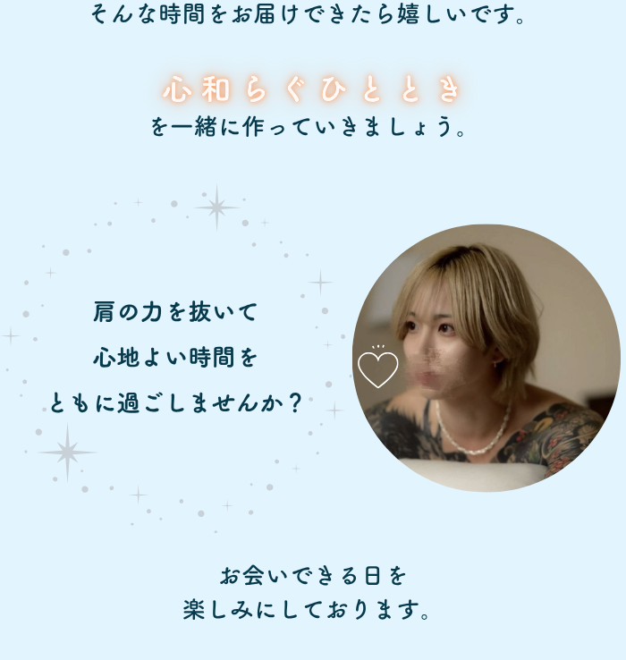 ご予約の際に、(ご利用日・セラピスト名・ハンドルネーム)を添えて「口コミ特典利用」とお伝えください。