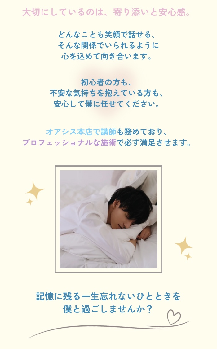 詳しい施術内容は省きますが、女風は今まで有名店で何度か経験してますが、丁寧なカウンセリングや、やり取り、施術を含め全体的に今までで1番最高なセラピストさんだったように思いました。