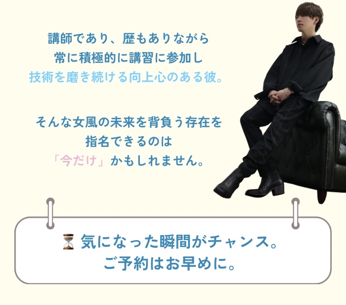 プロとして学びになる部分が多かったのはもちろんですが、それ以上に「お客として純粋に感動した自分」がいたのが正直なところです。安心感と心地よさに包まれ、気づいたら完全に身を委ねてしまっていました。同業だからこそ分かる“異次元のレベル”を実感できる体験でした。
