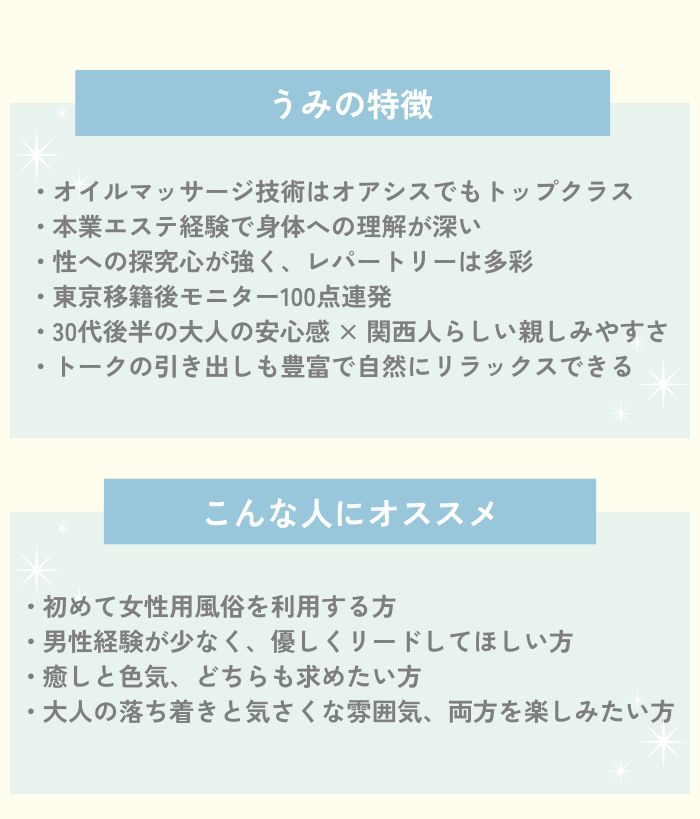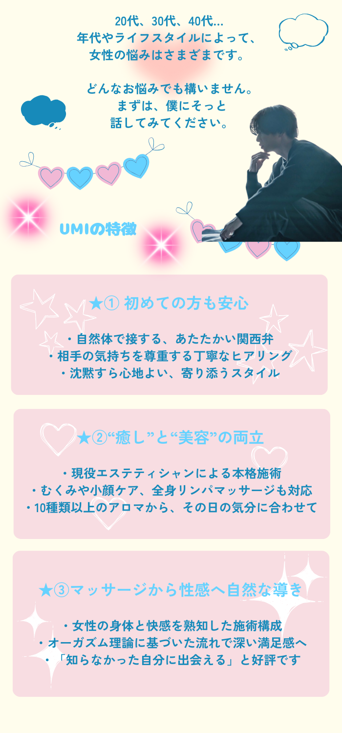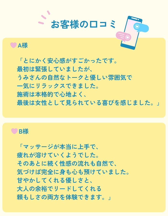 女性用風俗の利用が初めてで緊張しっぱなしでしたが、カウンセリングの間ずっと優しく手を握ってくれていたのでとても安心出来ました。うみさんは傾聴力が高い方だと思います☺️