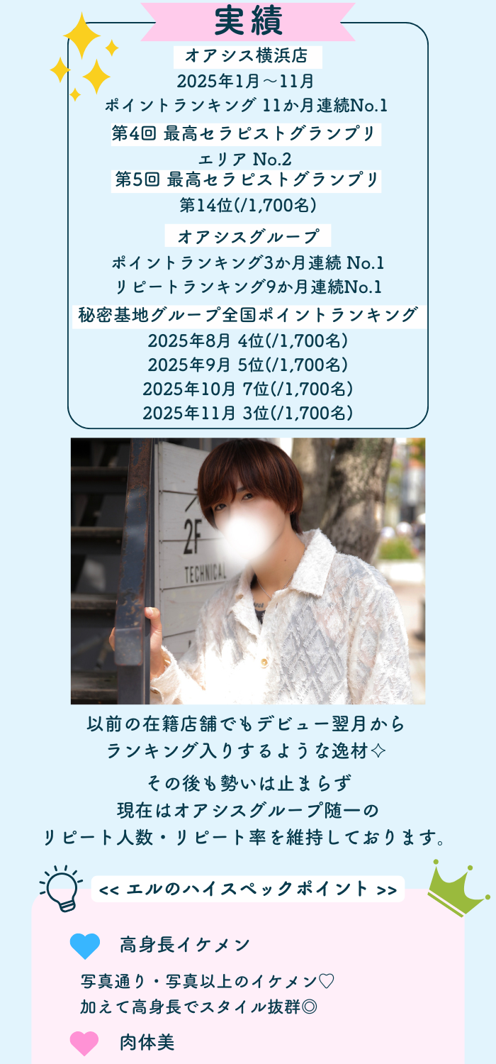 初めて利用しました。DMでお話をたくさんしてくれた時、丁寧に返信をしてくれたり楽しませてくれて良かったです。当日、直接会った時はかっこよすぎて直視出来なかったです笑カウンセリングも丁寧でして欲しいことを聞いてくれたり、推奨してくれたりして話しやすかったです。施術になると、施術前と雰囲気が変わってドSになるエルくんやばかったです。施術が終わると、優しくてリードしてくれて安心感がとても良かったです!