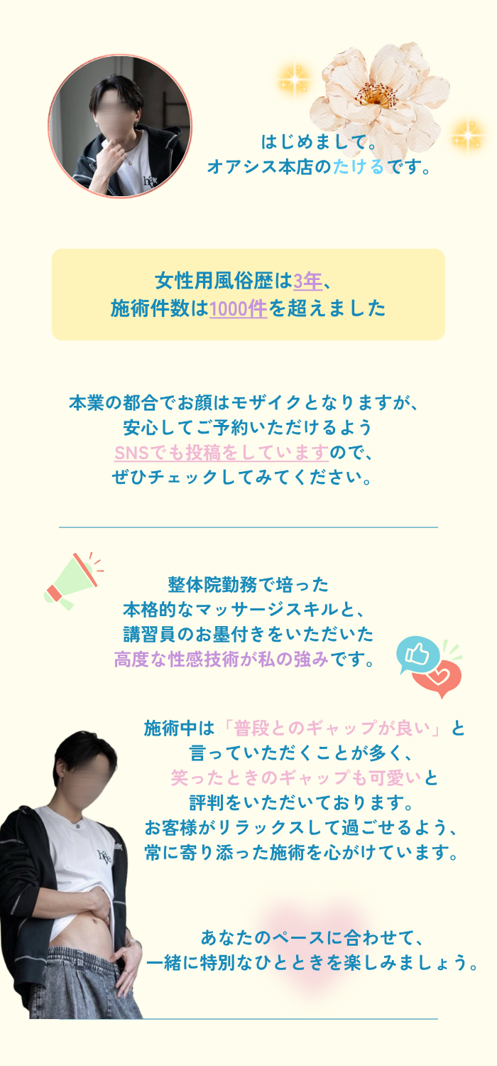 たけるくんは安心してお任せできるセラピストなのでオススメです。