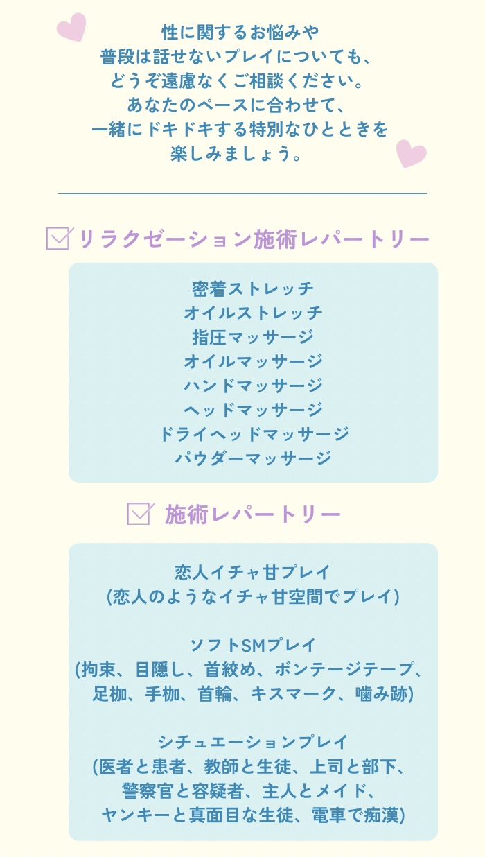 ほとんどまともに回答できていなかったと思いますが💦こちらの様子を見ながら調整してくださって、こういうプレイが好き!を上手に答えられない初心者には大変ありがたかったです。