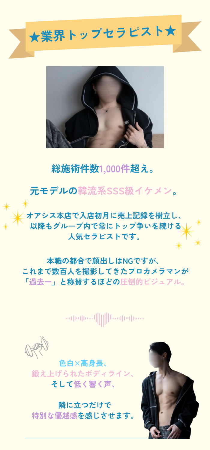 イケメンで爽やかで柔らかい雰囲気の方です。施術もすばらしいですが、たけるくんの天性の愛嬌?大型犬みたいな人懐っこさ、人柄が人気の秘訣なのかなと思いました✨