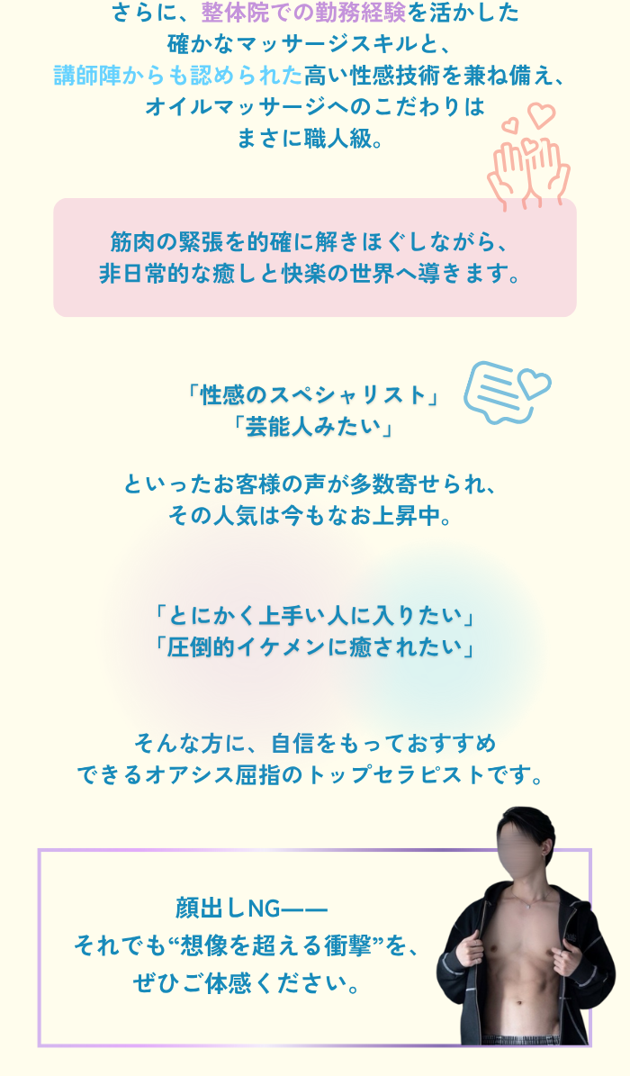 イケメンだけでなく、オイルマッサージも性感も、めちゃくちゃ技術が高かったです。特に、今までフェザータッチで感じたことがなかったけど初めて感じました。