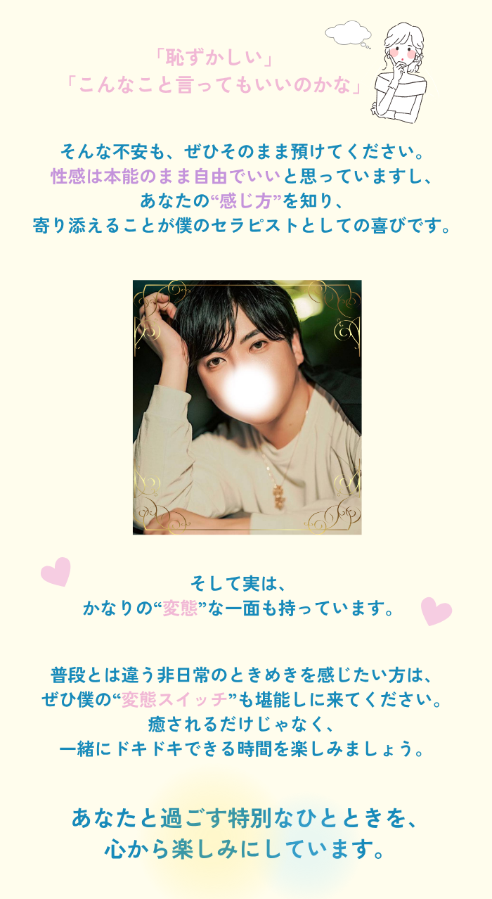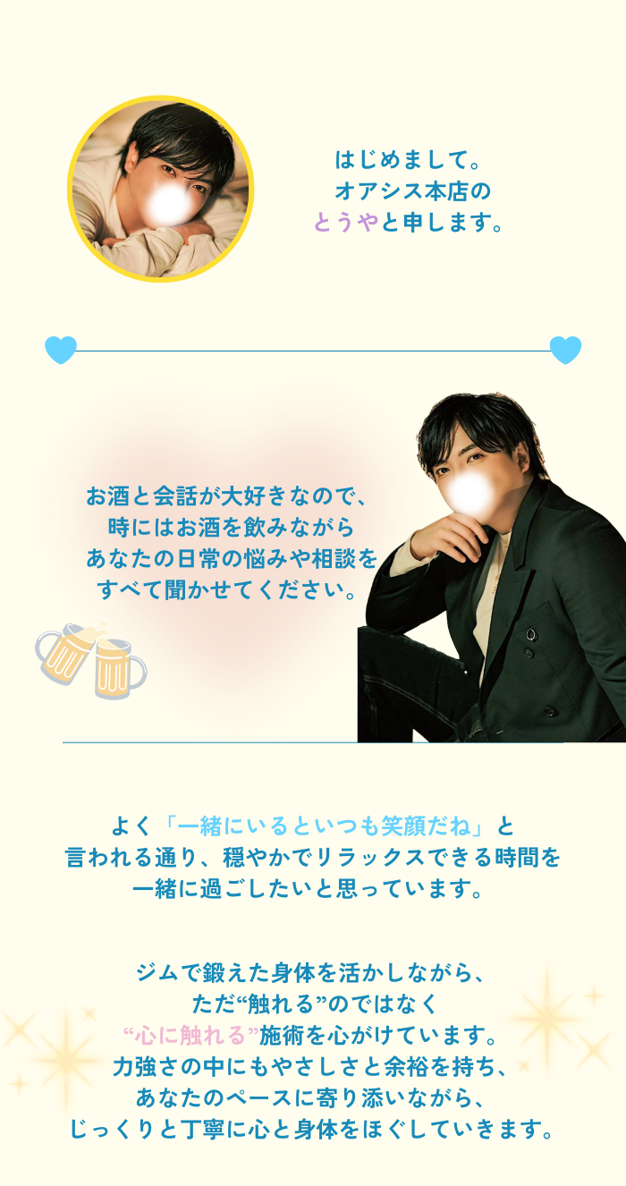 きっとみんな、どんな人か分からないって最初は思うかもしれないですけど、とうやくんはその人の1番理想としてる関係性や距離感を親身に考えてくれるセラピストさんなので、信じて1度入ってみる事をオススメします🥰💓