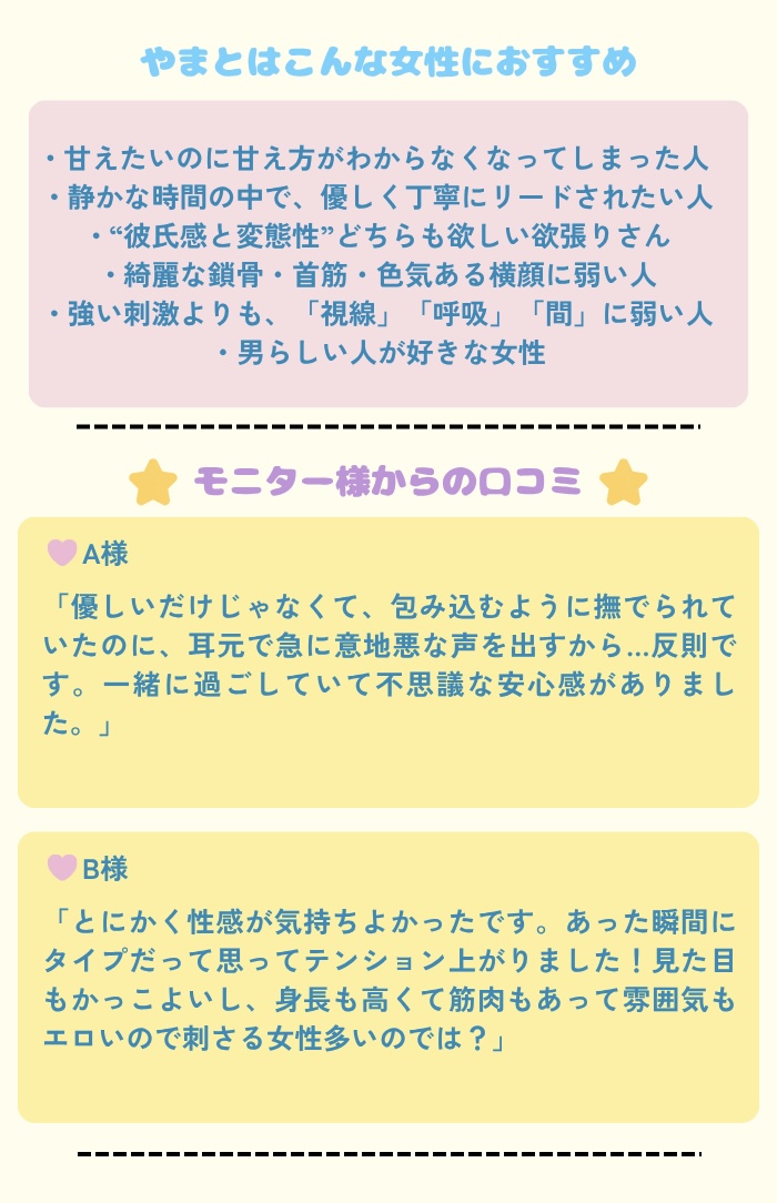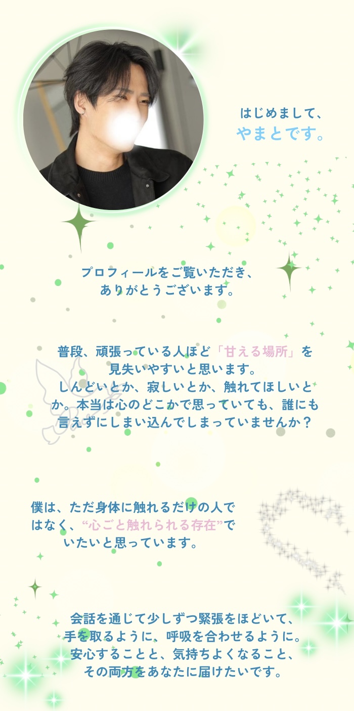 やまとさんはDMの時から定型文の営業ではなく、誠実に色々なお話で打ち解けたので、今回予約しました。初めてでドキドキしていましたが、会った時から自然なエスコートで緊張がとけました。