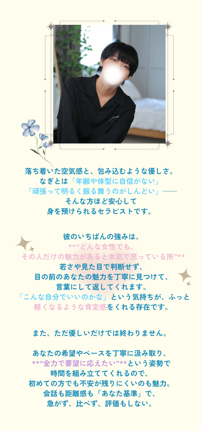 カウンセリングの時から自然と身体が触れ合う距離で、ぴったり寄り添いながらのお話。耳元に落ちてくるなぎとくんの甘い声が、鼓膜からじんわり溶けていくみたいで…ドキドキしているのに、なぜか安心してしまう不思議な感覚でした。配信でお声は聞いていましたが、実際はもっといいお声で直接聞けて本当によかったです。