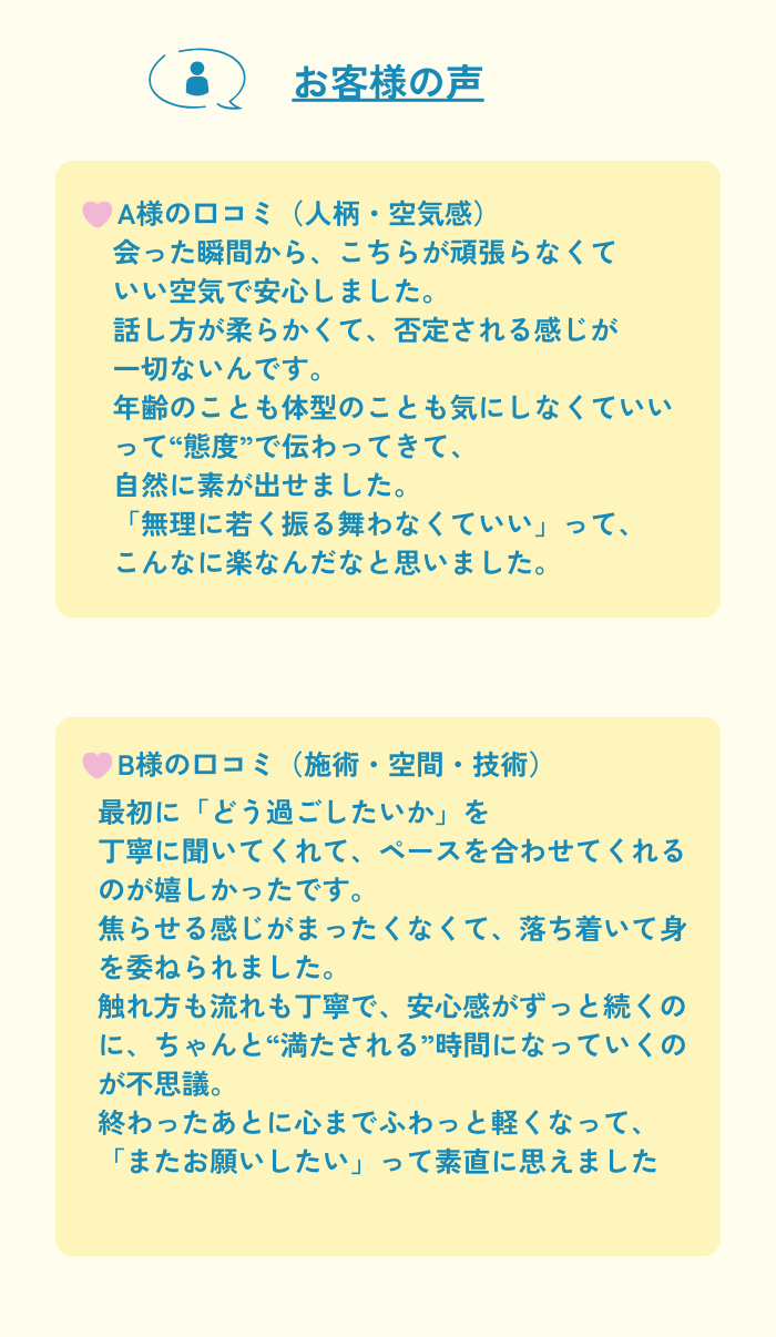 カウンセリングは一つ一つ丁寧にしてくれて、施術に関しても私の気持ちいいところを捉えるのがすごく上手だなって印象でした👏