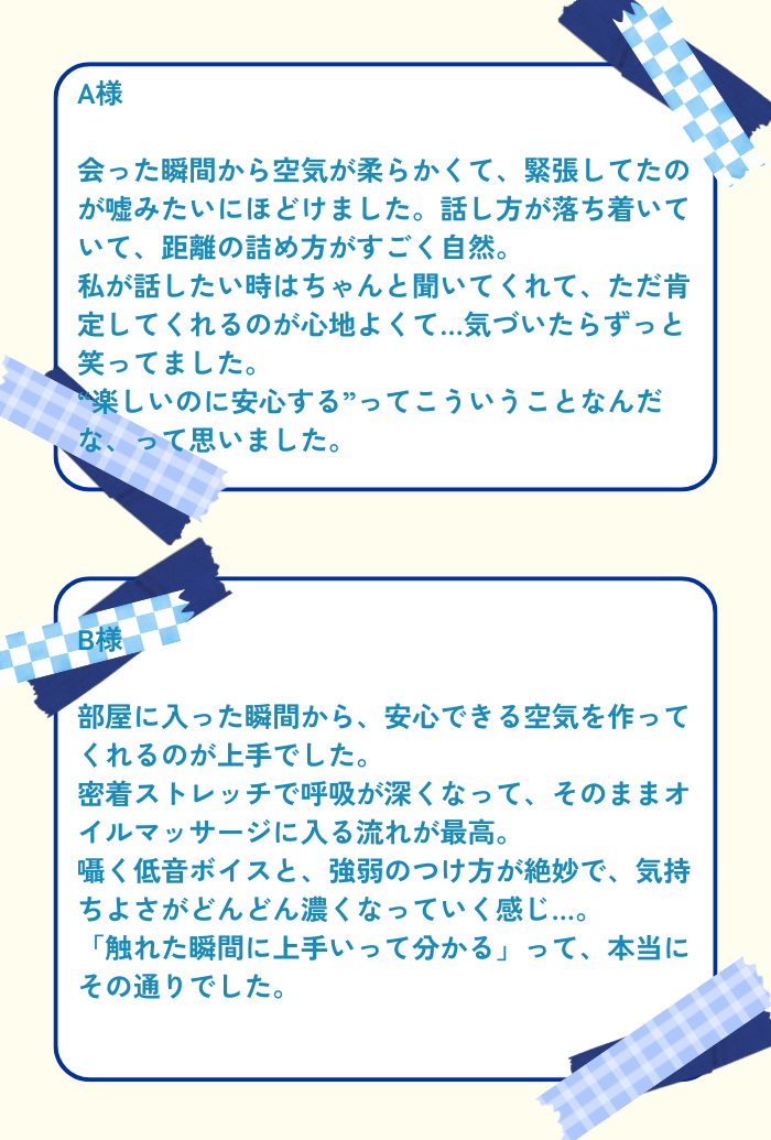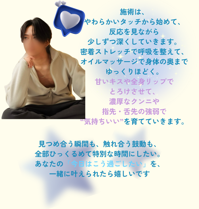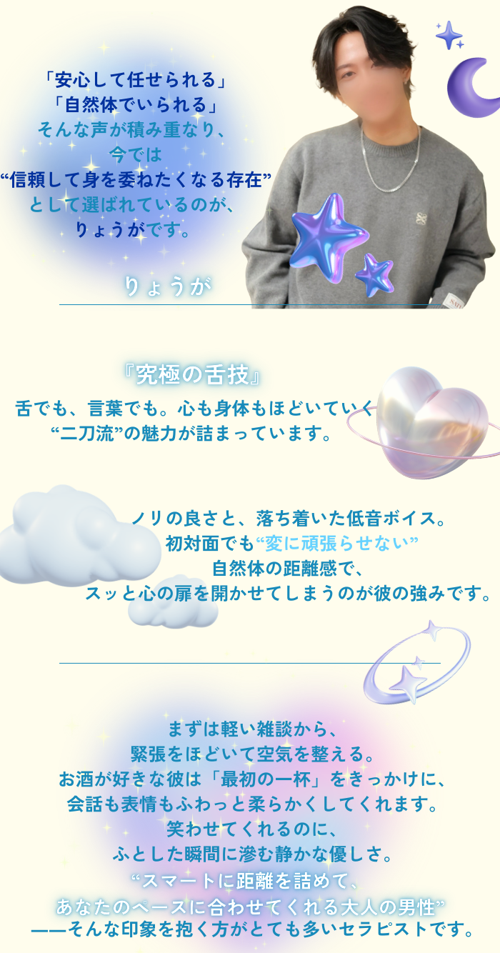 りょうがさんの施術は、優しさの中にほどよい“Sっ気”があって、そのバランスがとても心地良かったです。