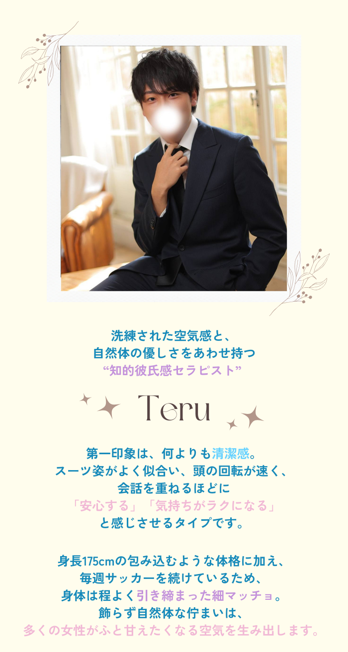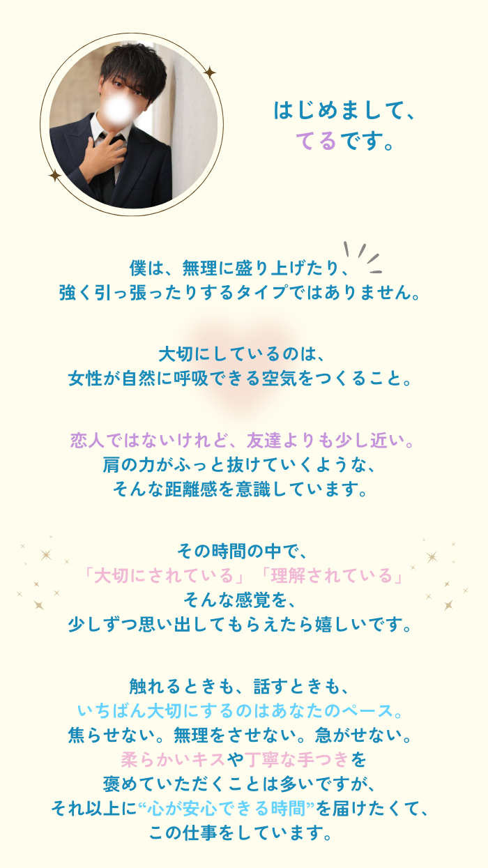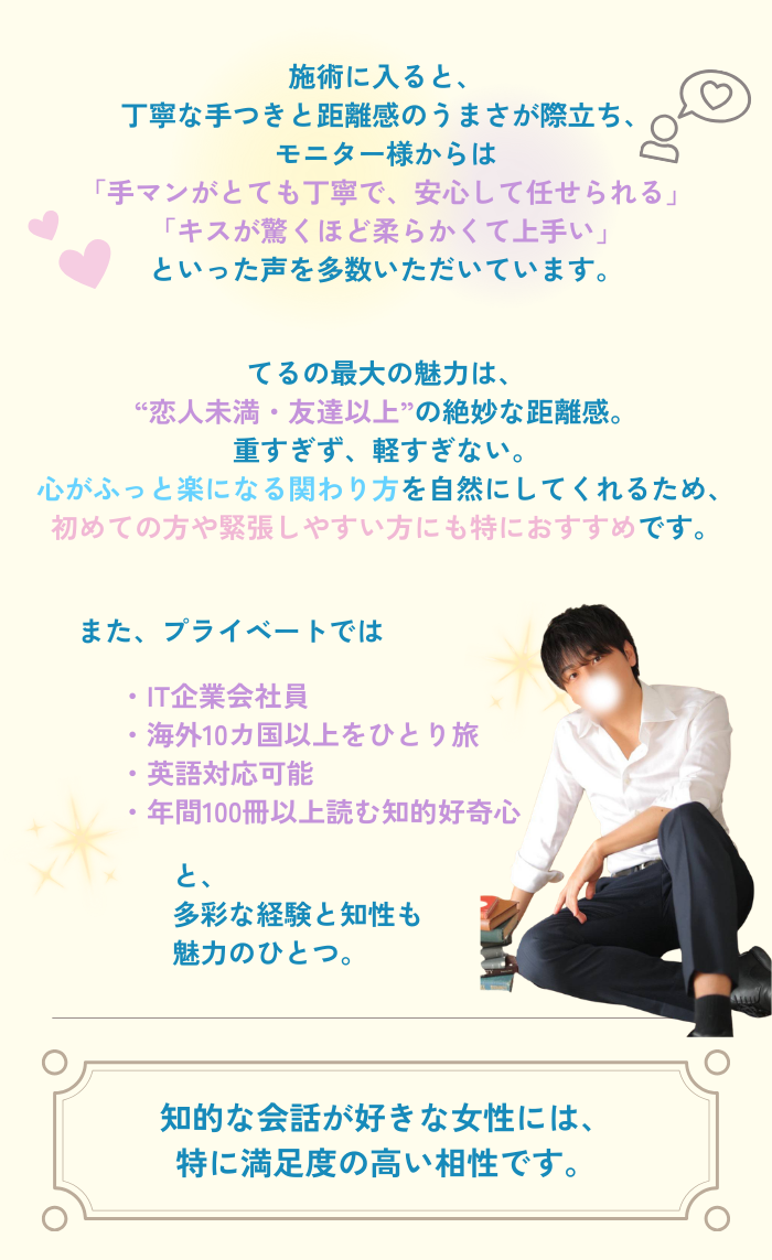「今日はどんな時間にしたい?」とちゃんと目を見て聞いてくれて、無理に踏み込まず自然に距離を縮めてくれる感じが心地よかったです。