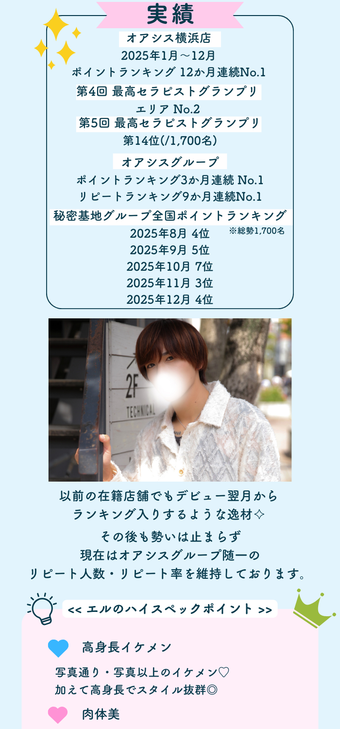 長く女風を利用してますが、初めての事が多く、エルくんが人気の理由が施術だけではなくて、ホスピタリティがとても素晴らしいのだと感じました✨