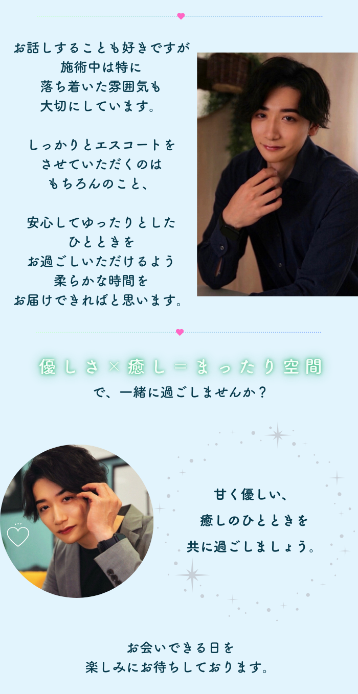私はトークの仕事をしていて、ゆのさんの出会い、こういう会話の仕方があるんだと、お勉強になりました。ストレッチとマッサージだけですが、お話ししながら、まったりした時間をいただきありがとうございます。またよろしくお願い致します。一期一会だと思いながら、一回ずつ大切な時間として会いたい、素敵なセラピストさんです。