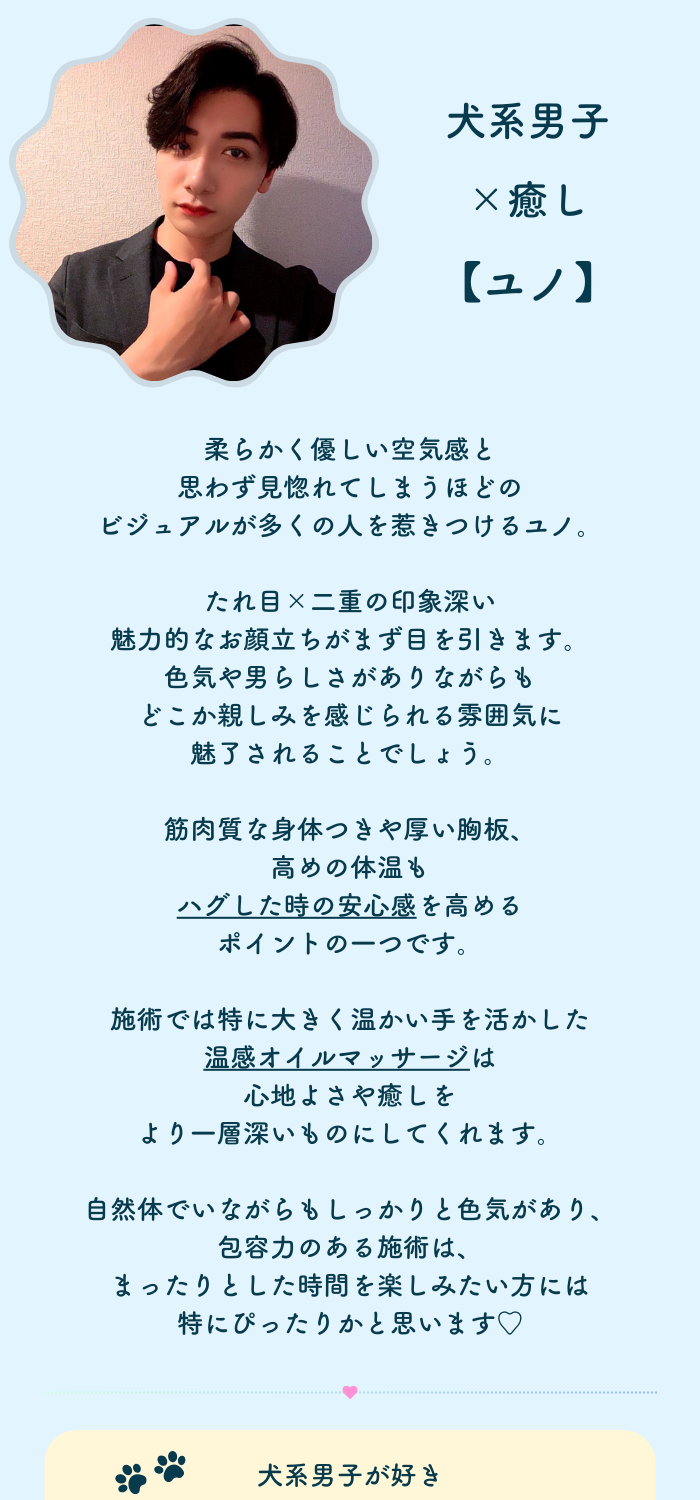 実際にお会いしたゆのさんは笑顔がキラキラで、本当に人懐っこいわんちゃんのような雰囲気ですが、施術に入ると目と声がセクシーでギャップにやられてしまいました。