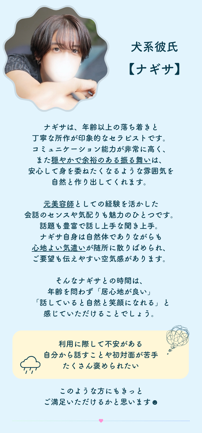 実はなぎさくんのマッサージ技術は思いやりが人一倍あるから気持ちよく寝れるレベルだったんだと思います。。自分不眠症なので、少し寝落ちできてスッキリしました!♡