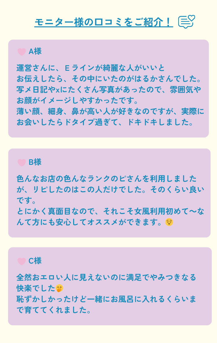 慎重な私は日記やキャスをたくさん見てハルカさんに決めました(^^)